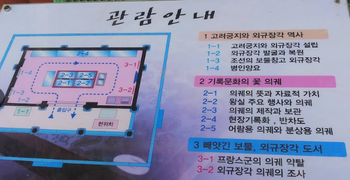 외규장각 안에는 의궤의 기록대로 왕실의 행사 행렬을 그대로 재현해 놓았다. 또한 145년 만에 반환된 의궤의 복제본도 전시되어 있다.