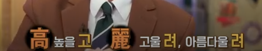 높을 고, 아름다울 려이다. 당시 고려를 읽을때 '고리(나라이름 리)'라고 읽었다. 그래서 옛날 옛날 고릿적에... 이때 고릿적이 고려시대일 적에 를 의미한다. 그래서 코리아도 고려보다는 고리에서 유래했을 가능성이 높다.