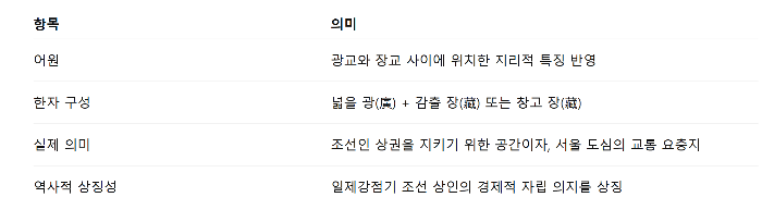 초기 구상: 처음에는 청계천의 **광교(廣橋, 너른 다리)**와 장교(長橋, 긴 다리) 사이에 시장을 지으려 했기 때문에, 두 다리의 첫 글자를 따서 '광장(廣長)'시장이라고 이름 지으려 했습니다.