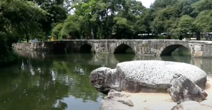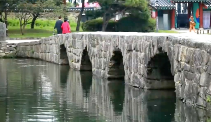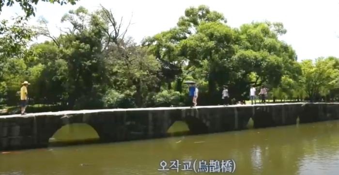 천상과 지상을 잇는 다리 오작교는 앙쪽 끝은 처지고 가운데는 높여서 무지개처럼 만들고 교각 하단부에 반원형의 구멍이 네 개가 나있는 다리, 홍예 다리는 길이가 58m 로 우리나라에서 가장 긴 홍예다리이다. 반달형 형태가 물을 만나 원형의 형태를 띄면서 하늘을 상징하는 것으로 반달 4개 를 만든 이유는 땅을 상징하는 사각형, 동서남북 , 춘하추동의 우주 만물의 의미가 내재되어 있다고 볼수 있다. 하늘과 땅과 사람이 하나의 공간에서 조화를 이루는 상징적인 공간을 조성한 것이다.