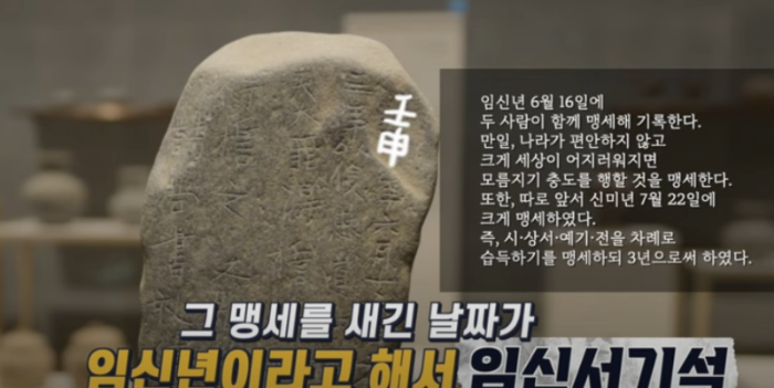 우리나라 교과서 시험에 꼭 나오는 비석으로 임신서기석은 신라에서 유학교육이 이루어졌다는 근거로 제시되는 유물로 화랑(젊은 엘리트 그룹)으로 추정되는 두 청년이 나라에 충성하고 유학을 열심히 공부하겠다는 다짐을 새긴 비석이다. 그 맹세를 새긴 날짜가 임신년이라고 해서 임신서기석이다.