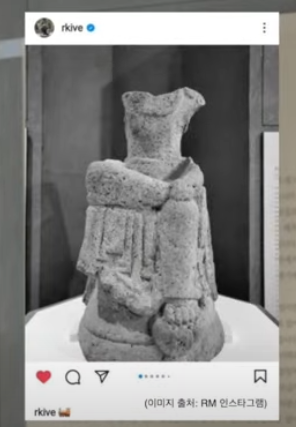 이 조각상은 경주 송화산 금산재에서 출토된 얼굴과 팔 부분이 떨어져 나가있는 석조반가사유상으로 의자에 앉아 오른발을 왼쪽 무릎에 올리고 오른손은 턱을 괸 채 고요히 앉아 생각에 잠겨있는 모습이고 석가모니가 출가하기 전 깊이 사색하던 모습을 표현한 것이다. 이것이 굉장히 유명해지는 계기가 있었다. BTS RM이 이 조각상을 찍어 인스타에 올려 전 세계인들이 주목했던 조각상이다.