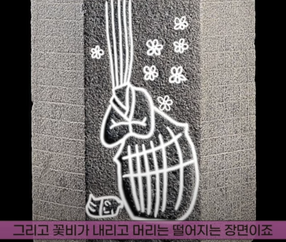 이차돈의 목을 쳤을때 흰 피가 솟구쳐 오르는 장면과 꽃비가 내리고 옆에 머리는 떨어져있고 땅이 흔들리는 장면이 새겨져 있다. 불교 공인을 위해 이차돈이라는 사람이 희생한 것을 기리기 위해 이렇게 비석을 세운 것이다. 미술관 불교 조각실에서 매시 정각 20분, 40분 마다 이차돈 순교의 과정을 표현한 디지털 맵핑 영상 이차돈 -꽃비 내리는 길을 볼 수 있다.