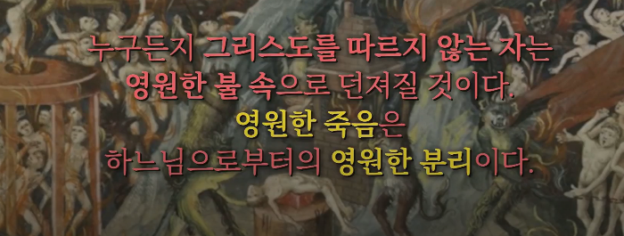모든 인간은 태어날때부터 원죄가 있으며 이로 인해서 한번 불지옥에 떨어진 죄인은 영원히 나올 수 없다고 주장했다. 그리고 로마는 영원한 지옥을 교리로 삼아 공포 통치를 꾀한다.