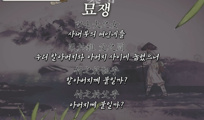 얼토당토않는 일을 겪은 땅주인은 부당한 일을 당했으나 양반을 상대로 어쩔 도리가 없었다. 그런데 이 억울한 사연을 가진 광주의 내 집에 김삿갓이 방문하게 되고 우연히 이 사연을 들은 김삿갓은 한끼 식사에 대한 은혜를 갚겠다며 붓을 집어 든다. 그 시가 바로 '묘쟁'이라는 시이다.