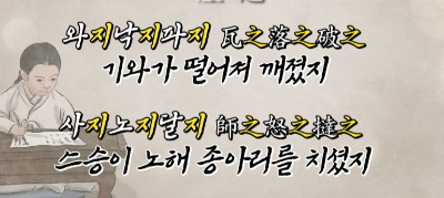 김삿갓이 8살때 새를 잡으려고 지붕에 올라갔다가 기와장을 깨뜨리자 훈장님이 회초리 12대를 맞을 것인지 시를 지을 것인지 물었고 이에 김삿갓은 시를 짓겠다고 한다. 그런데 훈장님이 내놓은 시제는 12개의 갈 '지' 자였다.