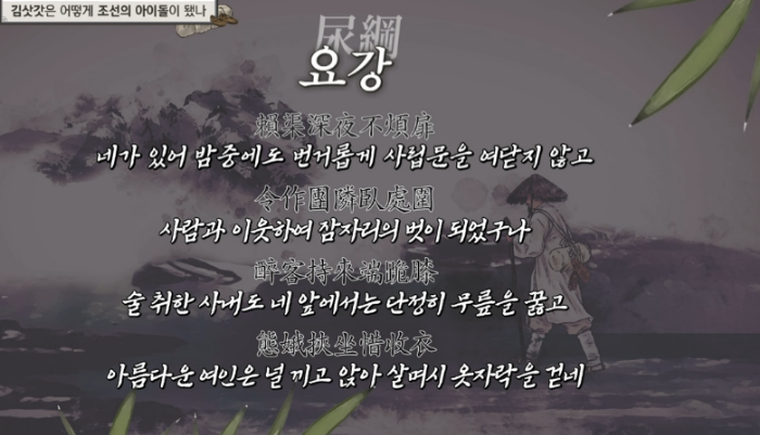 체통이 중요했던 조선시대 양반들은 거들떠보지도 않는 다양한 소재로 시를 썼던 김삿갓이다. 술을 좋아하는 양반 혈사이에서 천재적인 제주로 시를 쓰는 김삿갓은 유명 인사가 되었다.