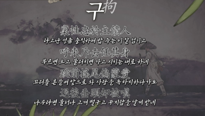 구 라는 시는 언뜻 보면 충직한 개에 대한 시를 쓴것으로 보여진다. 백성들은 이 시를 보고 열광한다.