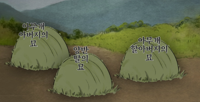 한 양반이 딸을 잃고 딸의 무덤터를 찾고 있었는데 그러다 아주 좋은 터인 자리를 찾게 되었다 그런데 이곳에는 이미 어느 백성의 아버지와 할아버지의 묘가 있었고 이에 양반은 원래 있던 무덤 사이에 딸의 묘를 만들어 놓은 것이다.