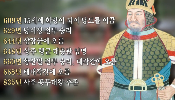 629년 낭비성 전투를 시작으로 김유신은 뛰어난 실력을 바탕으로 전투에서 승승장구하면서 이름을 알리기 시작한다. 신라 최고 관직은 각관과 대각관에 이어 태대각관에 오르게 되고 사후에는 흥무대왕으로 추존된다.