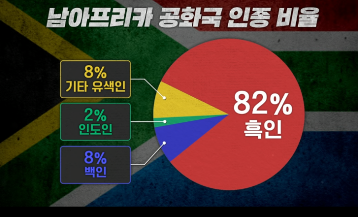현재 남아프리카 공화국 인종 비율은 흑인이 82%, 백인 8%인데 남아공 전체 소득은 대부분이 백인의 몫으로 남아공은 전 세계에서 소득 불평등이 가장 심한 나라 1위이다.