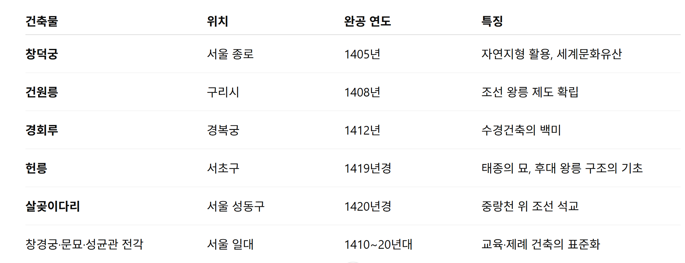 태종의 명으로 **경복궁 연못 위의 경회루(慶會樓)**를 중건하였다. 조선 수경건축의 대표작으로 손꼽힌다.