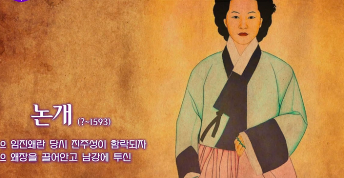 논개에 대한 1차 사료가 거의 없다. 논개가 처음 문서로 기록된 것은 유몽인의 <어우야담> 이 최초 기록이다. 19세기 들어서면서 논개가 기생이 아니라는 얘기가 있는데 전라북도 장수 사람이고 논개의 성은 주씨로 진주성을 지키러 왔던 의병장 최경회 장군의 후처였다는 설이 있다.논개는 1차 전주성 전투 직전에 왔다. 진주성 2차 전투에서 최경회 장군이 사망하자 논개는 바위 끝에 선다.