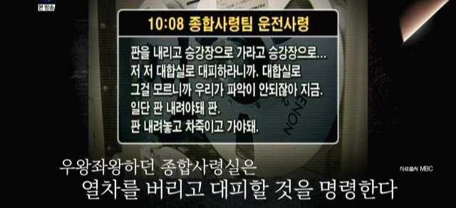 아주 혼란스러운 상황임에도 방송으로는 '그 자리에 있으라' 고 방송을 했고 그렇게 시간을 한참 끌다가 뒤늦게 위험한 걸 깨닫고 대피 안내를 했으나 그땐 이미 골든 타임임을 놓친 상황이었다.