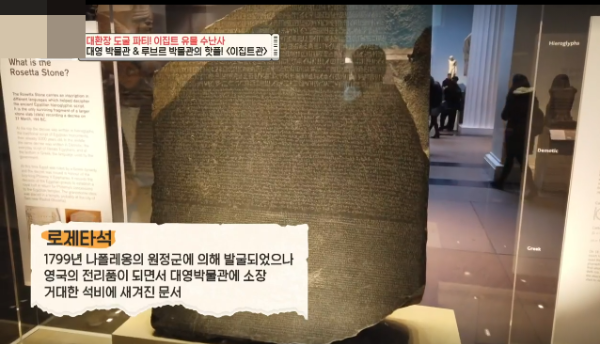 그 중에 가장 유명한 이집트 유물을 로제타석이다. 1799년 나폴레옹의 원정군에 의해 발굴되었으나 영국의 전리품이 되어 대영박물관에 소장된 거대한 석비에 새겨진 문서이다.