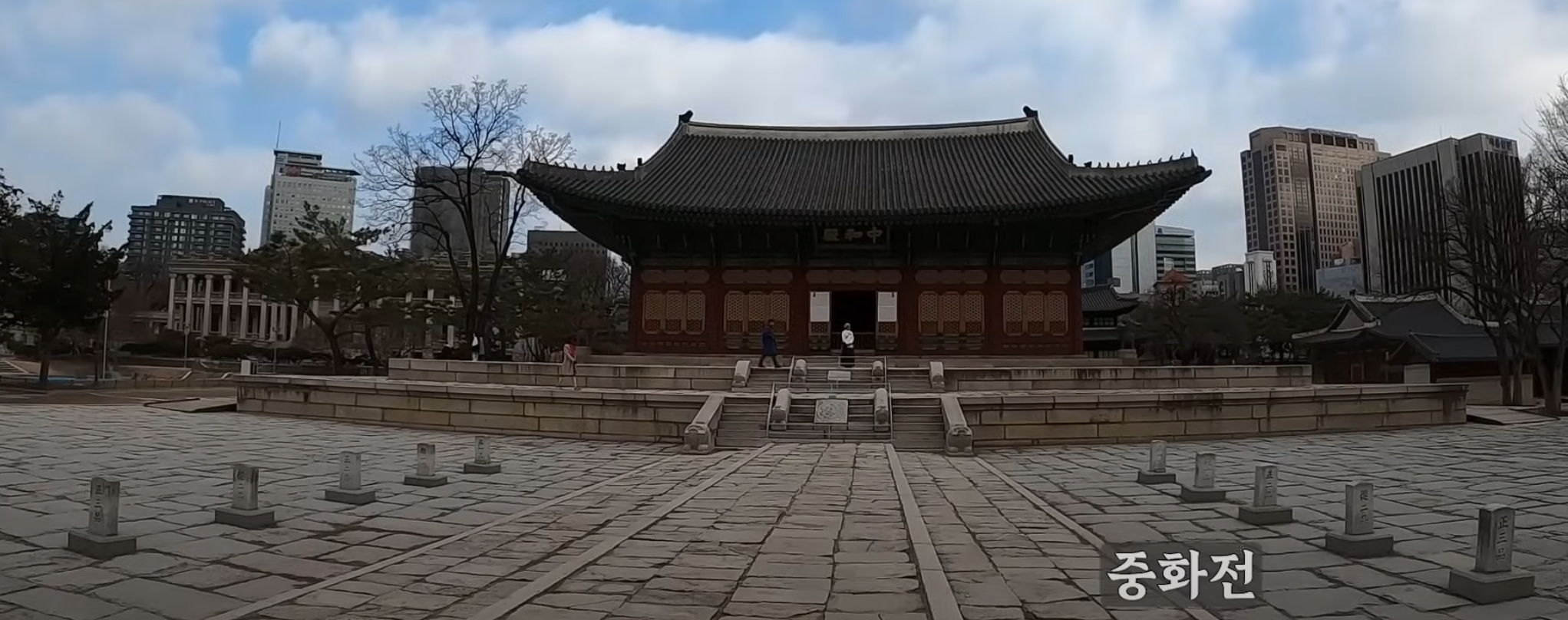 금천교를 지나 나오는 곳이 중화문과 중화전이다. 1902년 고종이 경운궁을 환궁한지 5년이 지난 시점이다. 중화전으로 들어가는 답도에는 황제를 상징하는 용 두마리가 새겨져 있다. 중화전은 외국 사신 접객 ,국가 행사를 치르던 곳인데 원래는 2층으로 지었으나 중화전 중건이후 2년만에 불이나 다시 2년 뒤에 규모를 축소하여 지은것이 지금의 단층 중화전이다.
