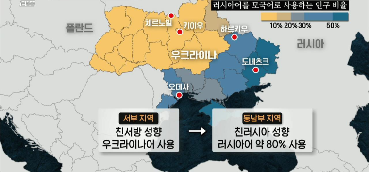 동서로 갈라진 우크라이나는 서로 다른 문화권을 형성하게 된다. 우크라이나 서부지역은 강한 친서방 성향과 함께 대부분이 우크라이나어를 사용하면서 러시아를 사용하지 않지만 우크라이나 동남부 지역은 친러시아 성향과 함께 러시아어를 약 80%를 사용하고 있다.