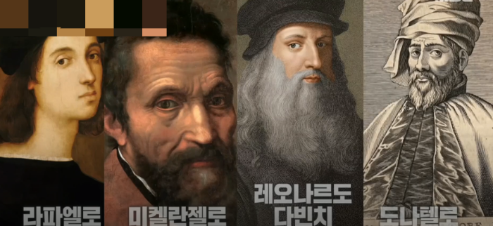 르네상스 시대의 4대 미술거장은 라파엘로, 미켈란젤로 레오나르도 다빈치, 도나텔로가 있다.