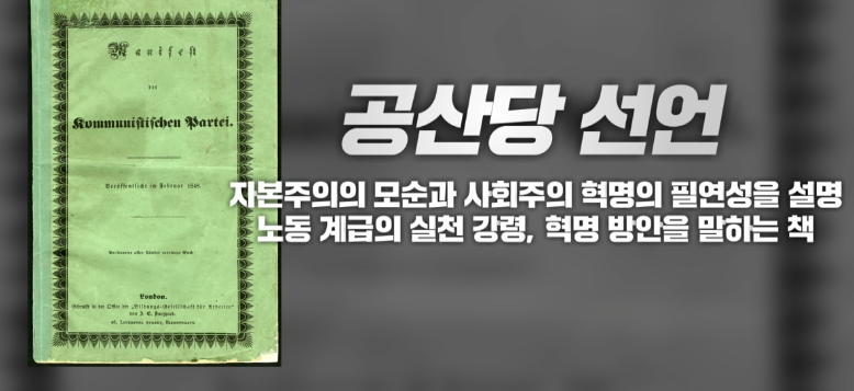 1848년 유럽에 근대화가 시작되면서 사회 경제 문화 등 모든 면에서 혁신적인 변화가 일어났던 해이다. 이때 벨기에 브뤼셀에서 이런 변화를 전면적으로 부인하는 한 권의 책이 나온다. 그 책은 카를 마르크스의 '공산당 선언'이다. 공산당 선언은 사회주의의 성서라고 불리는 책인데 이 책을 쓸 당시 카를 마르크스는 29 살이었다.