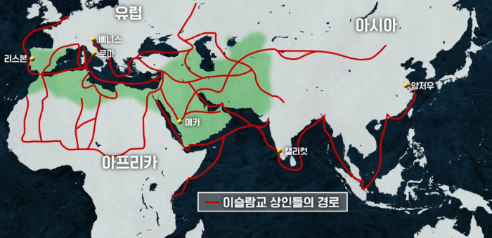 이슬람교의 기폭제가 된 것은 이슬람 상인들로 당시 비단이나 도자기 등 귀중품을 거래할 때 꾸란도 함께 건네면서 교역했고 중국과 교역을 위해 동남아시아를 거쳐갔던 이슬람교 상인들 때문에 현재도 동남아시아는 이슬람교가 많다.