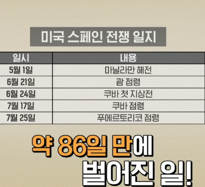 그리고 3일 뒤 1898년 6월 24일 미국 스페인의 전쟁의 원인이었던 쿠바에서 첫 지상전이 시작되엇다. 그리고 쿠바 또한 7월 17일 쉽게 점령하게 된다. 8일 뒤 7월 25일 또다른 스페인 식민지 푸에르토리코도 점령한다.  이렇게 86일 만에 이 모든일이 벌어진 것이다.