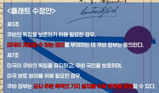 1902년 5월 20일 미국은 쿠바를 독립시킨다. 미국은 플래트 수정안에 따라 쿠바 동부에 관타나모 해군기지를 건설한다. 미국 군사지원을 위한 항만 시설 및 공항 활주로가 설치 되어 있고 현재는 포로수용소로 운영 중이다. 여론은 이곳을 쿠바에 돌려줘야한다고 하지만 미국은 이는 수락하지 않고 아직까지도 이곳을 가지고 있다.