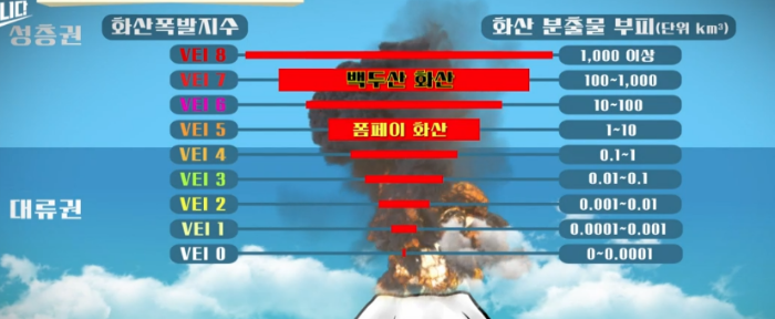 그래서 백두산 화산폭발지수를 7로 측정하고 있다. 무거운 화산재는 근처에 쌓이게 되고 가벼운 건 멀리 확산되어 백두산 밀레니엄 대폭발은 인류가 겪은 가장 큰 화산 폭발이였을 것이라고 추정하고 있다.