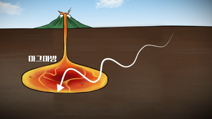 백두산의 마그마방은 100km 넓이에 지하 깊이 아래 5km 즈음에 위치하는 걸로 확인이 되었다. 그 증거로 맨클에서 기원한 가스가 누출되고 있고 고온으로 인한 고사목지대가 형성되고 있다. 바닷물로 식힐 수 있는 부분은 아주 조금이다.
