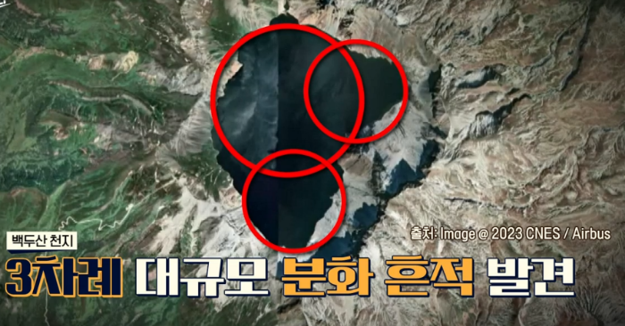 분화구의 모양을 보면 화산이 몇 차례 분화됐는지 알수 있는데 백두산은 여러 서클이 겹쳐 있는데 적어도 3차례 대규모 분화 흔적이 확인되고 있다.