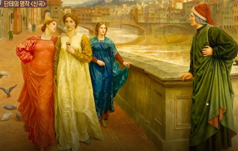 단테는 14세기 초기 르네상스 이탈리아를 대표하는 작가인데 9살 꼬마 단테는 산타 트리니타 다리에서 처음 베아트리체를 만나게 되게 첫눈에 반해버린다. 그리고 9년이 지난 후 18세에 산타 트리니타 다리에서 다시 조우하기 되는데 단테에게 살짝 목례를 하고 가는 베아트리체에게 단테는 심장이 터질 만큼 베아트리체를 사랑하게 됐고 그날부터 그녀를 생각하며 시를 쓰기 시작한다.