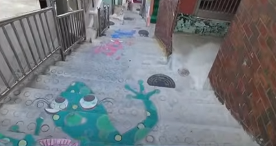 비가오면 산기슭에서 내려와 도룡뇽이 많이 다니기 때문에 계단에 도룡뇽을 그려놨다. 그림이 있어 힘든 줄모르고 오르내릴 수 있다.