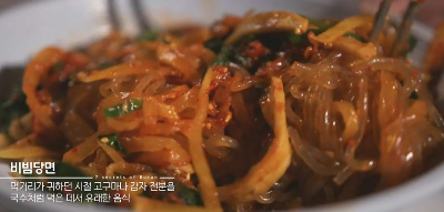 비빔 당면은 당면을 삶아 야채와 매운 양념을 넣어 마지막에 참기름을 넣고 비벼먹는 것으로 먹거리가 귀하던 시절 고구마나 감자 전분을 국수처럼 먹은 데서 유래한 음식이다.