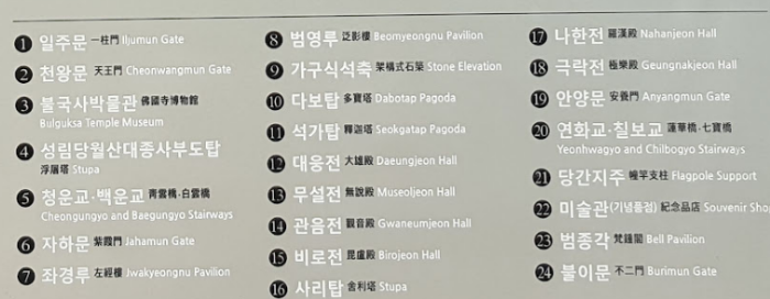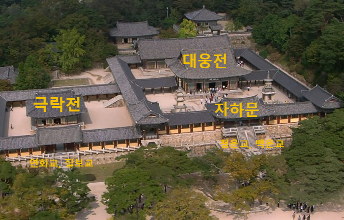 불국사는 크게 3구역으로 나뉜다. 석가모니 영역, 비로자나 영역, 아미타 영역으로 나뉘고 불국사에서는 석굴암(국보 24호) 을 포함해 총 7개의 국보가 있다. 석단 위의 공간은 부처의 나라 , 석단 아래 공간은 이승을 의미한다. 또한 두개의 세계를 연결하는 청운교, 백운교, 연화교, 칠보교가 있다.