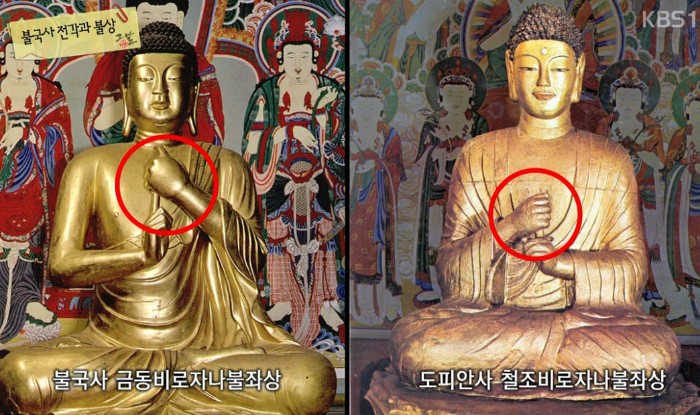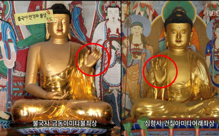 보통 불상은 오른손을 들고 있는데 불국사의 극락전과 비로전의 불상만 왼손을 들고 있다. 왼손은 주로 무명의 중생을 의미한다. 그러나 왜 바뀌였는지 아직 밝혀지지 않았다. 진짜 불국사는 구품연지속에 있었던 것이 아닌가 싶다.