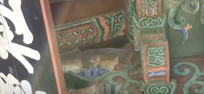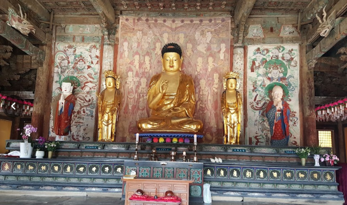 대웅전 안에는 석가모니가 모셔져 있고 주변에 동물상들이 많이 있다. 코끼리, 사자, 주작, 원숭이, 봉황, 새들이 구석구석 배치되어 있다. 동물상을 배치한 이유는 문수보살은 사자상, 보현보살은 코끼리상등으로 여러 보살들을 형상화 하고 있다.
