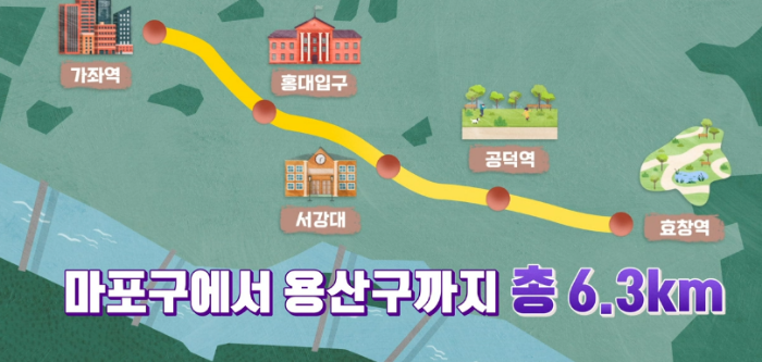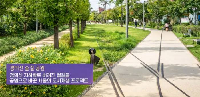 경의선이 지나가던 철로를 경의선을 지하화 하면서 버려지게 되었는데 공원으로 바꾸는 도시재생 프로젝트를 진행했다. 낙후된 철길 주변 지역이 공원과 함께 급부상하게 되었다. 경의선 숲길의 길이는 6.3km 로 길이는 센트럴파크보다 길다.
