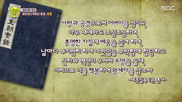 세종의 아버지는 태종 이방원으로 세종은 태종의 셋째아이들 충녕대군이다. 첫째는 양녕대군으로 양녕대군 또한 똑똑했으나 하필 동생이 충녕대군(세종)이 다방면으로 천재성을 보인 충녕을 보고 넘을 수 없다는 걸 느꼈던 걸까?