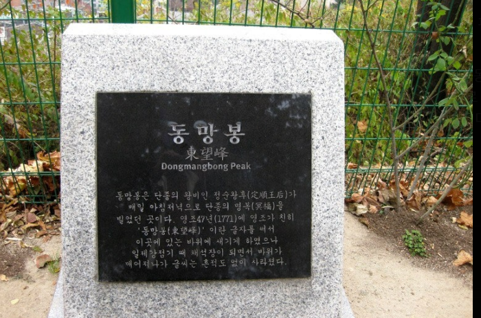 정순왕후가 단종을 그리워하며 올랐던 동망봉은 해발 95m의 야트막한 산봉우리로, 현재 공원 최고점에 자리한 팔각정자 동망정이 건립되어 있다. 이 정자에서는 동대문 일대의 도시 풍경을 조망할 수 있다. 1771년 영조가 '동망봉' 글자를 바위에 새기도록 했으나, 일제강점기 채석장 개발로 흔적이 사라졌다. 현재 공원 입구에 '동망봉 터' 표지석이 설치되어 있으며, 방문객들에게 역사적 의미를 알리고 있다.