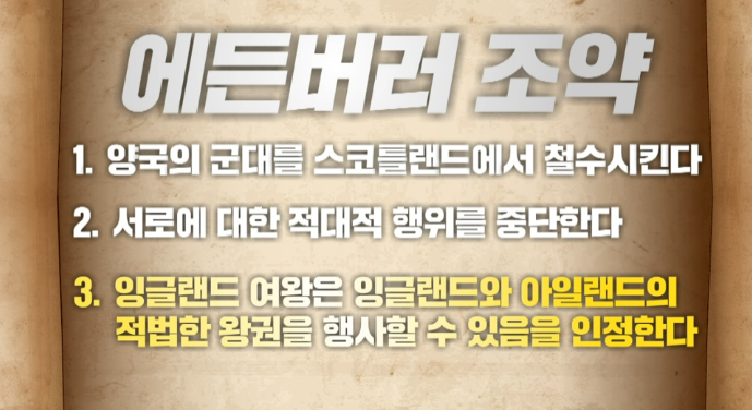 엘리자베스 1세는 후계가 없었고 그녀의 뒤를 이은건 메리의 아들 제임스 6세였다. 엘리자베스 1세가 제임스 6세에게 왕위를 넘겨주며 스코틀랜드와 잉글랜드의 역사 갈등은 마무리 되었다.