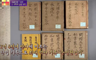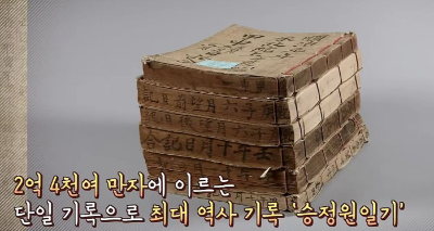 승정원 일기는 우리나라 역사 최대의 기록물로 세종때부터 작성된 기록으로 국왕 비서실인 승정원에서 정사 내용과 문서를 종합해 기록한 업무일지인데 인조(1623년) 부터 고종 (1910년) 까지의 기록만 전하고 있고 안타깝게도 광해군 때의 승정원 일기는 볼수가 없다. 총 책수는 3,243 책으로 조선왕조실록의 3배 이상의 분량이다.