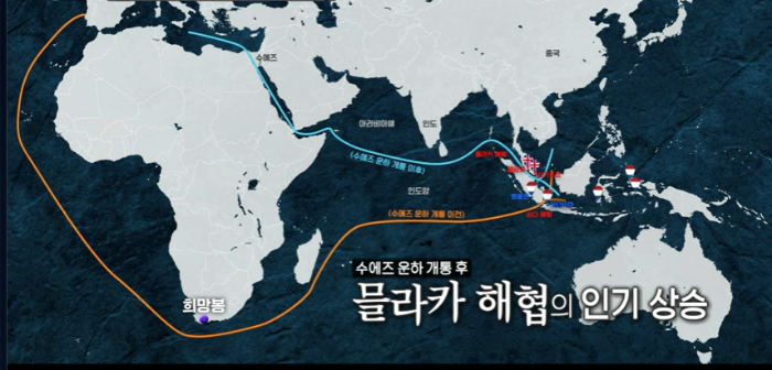 결정적으로 수에즈 운하가 개통되면서 멀리 아프리카 희망봉을 지나 인도양을 거쳐 왔던 루트가 수에즈 운하의 개통으로 유럽과 아시아를 잇는 최단 거리로 믈라카 해협이 인기 상승하게 된 것이다. 이전에 영국 런던에서 싱가포르까지 최소 120일이 소요되었으나 수에즈 운하 개통 후 50일로 단축이 된다.