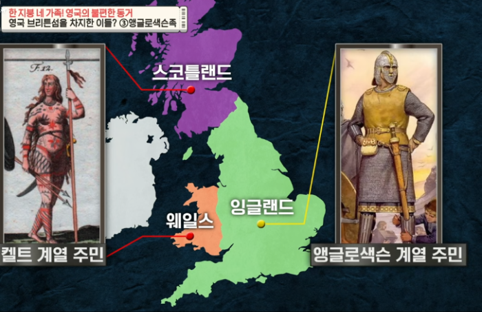 앵글로색슨족은 서부 지역에 모여 살던 켈트족을 이방인이라고 불렀는데 고대 영어로 그 단어가 바로 '웨일스' 였다. 그래서 웨일스가 이 지역의 지명이 되었다. 이처럼 같은 영국이여도 민족이 완전 다르다. 스코틀랜드와 웨일스 뿌리는 켈트족 계열이고 잉글랜드는 앵글로색슨 계열 주민이다.