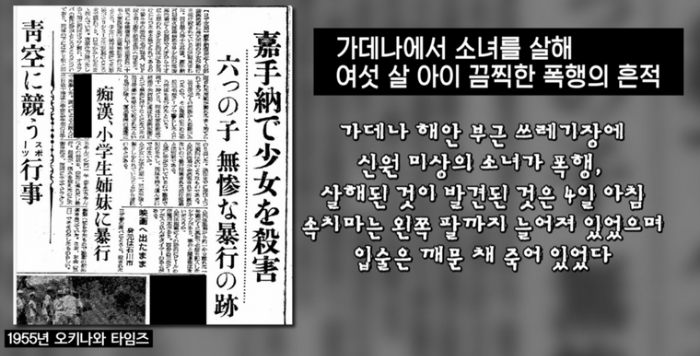 오키나와의 미군기지 확장으로인해 여러문제들이 발생하기 시작한다. 1955년 9월 4일 가데나 공군기지 근처 쓰레기 하치장에서 만 5세 여아의 시신이 발견된다. 유미코를 납치하여 성폭행한 후 복부에서 창자까지 날카로운 칼로 절단되어 잔인하게 살해를 했다. 이 잔인한 행각을 한 이가 미군이였던 것이다. 그런데 이 범인이 오키나와에서 재판을 받지 않고 미국의 군법회의에 회부되어 사형판정이 내려졌으나 범인이 본국으로 송환되면서 사형이 종신형으로 감형 그 이후 22년으로 감형되어 가석방되었다.