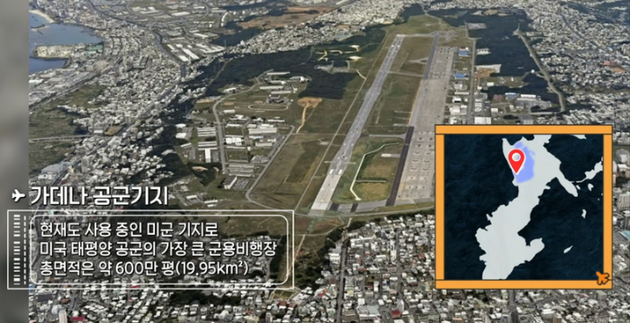 가데나 공군기지로 인해 학교 3곳과 마을 15개가 사라져버렸다. 이것을 시작으로 오키나와 북부에 북부 훈련장, 헬리콥터와 수송기 등을 운용하는 후텐마 해병대 항공기지등이 만들어졌다. 제 2차 세계대전 직후 오키나와보다는 일본 본토를 중심으로 미군 기지가 건설되었으나 1951년 샌프란시스코 조약으로 일본이 주권을 회복하면서 일본 본토의 미군 기지들은 오키나와로 이전되었다.