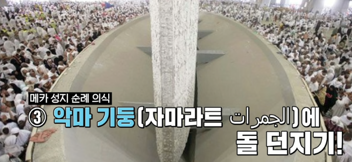 순례이 마지막 의식은 악마 기둥에 돈 던지기로 카바 신전에서 5km 떨어진 미나라는 곳에 자마라트라는 돌기둥에 작은 돌을 던지는 의식이다. 돌을 던지면 악마가 달아나고 신앙심이 정화된다고 믿기 때문이다.