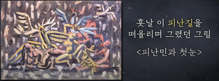 그때는 한겨울이었고 2,3살 아이들과 아내를 데리고 제주도로 내려와야 했다. 춥고 험한 한라산 내륙을 피해 해안가로 돌아오다 보니 주민들에게 고구마, 감자등을 얻어먹으며 너무 추우면 외양간에서 잠을 자며 꼬박 3일이 걸려 내려갔다. 그때를 생각하며 그린 그림 <피난민과 첫눈> 이다.