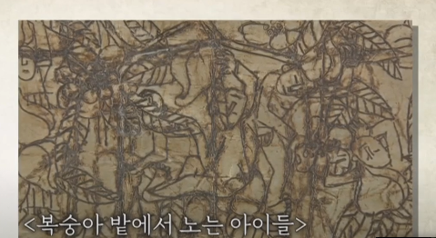 군동화 속 아이들의 특징을 보면 언제나 발가벗은 사내아이들이다. 생전에 죽은 첫째 아들의 모습이 옷도 제대로 입혀보기 전에 떠난 첫 아기의 기억을 그린 것이다. 아래쪽 복숭아 그림의 의미는 무병장수의 의미로 사랑하는 이들의 건강을 빌었을 이중섭이다.