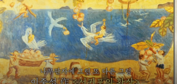 당시 제주도에선 그림재료 구하기가 하늘 별따기여서 주변의 나무판자를 캔버스 삼아 그렸던 그림이다. 나무판자에 그린 또 다른 그림 <서귀포의 환상 > 과 더불어 은박지에 그린 은지화, 장판지에 그린 <옛 이야기> 등 다양한 재료에 그림을 그리기 시작한다.
