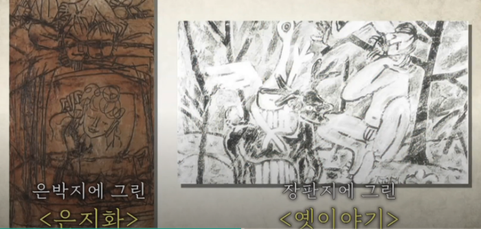 당시 제주도에선 그림재료 구하기가 하늘 별따기여서 주변의 나무판자를 캔버스 삼아 그렸던 그림이다. 나무판자에 그린 또 다른 그림 <서귀포의 환상 > 과 더불어 은박지에 그린 은지화, 장판지에 그린 <옛 이야기> 등 다양한 재료에 그림을 그리기 시작한다.