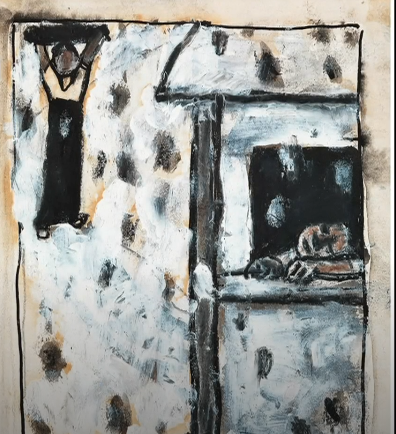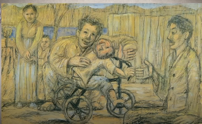 이때 그림 작품이 <시인 구상의 가족 > 구상 시인이 큰 아들에게 자전거를 가르쳐주고 있는 장면이다. 행복 그 자체이지면 우측은 이중섭 자신으로 평상에 앉아 그 모습을 바라보고 있는 모습이 어딘지 쓸쓸하고 외로워보인다. 이 전시회를 성공하면 아이들에게 자전거를 사줄수 있다고 생각했는데 ... 이중섭은 이후 정신적으로 완전히 무너져 버린다. 이끼던 그림까지 불태우며 그의 삶이 점점 피폐해지자 친구들은 그를 돌보기 위해 주변 친구의 도움으로 정신병원에 입원했다. 거식증까지 걸리고 술만 마시게 되니 황달 증상까지 찾아온다.
